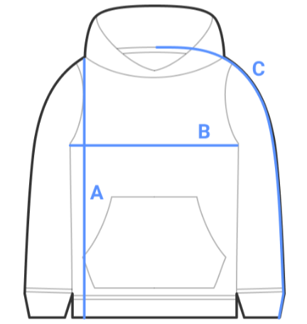 Place the end of a measuring tape beside the collar at the top of the hoodie (high point shoulder). Pull the tape to the bottom of the hoodie.
